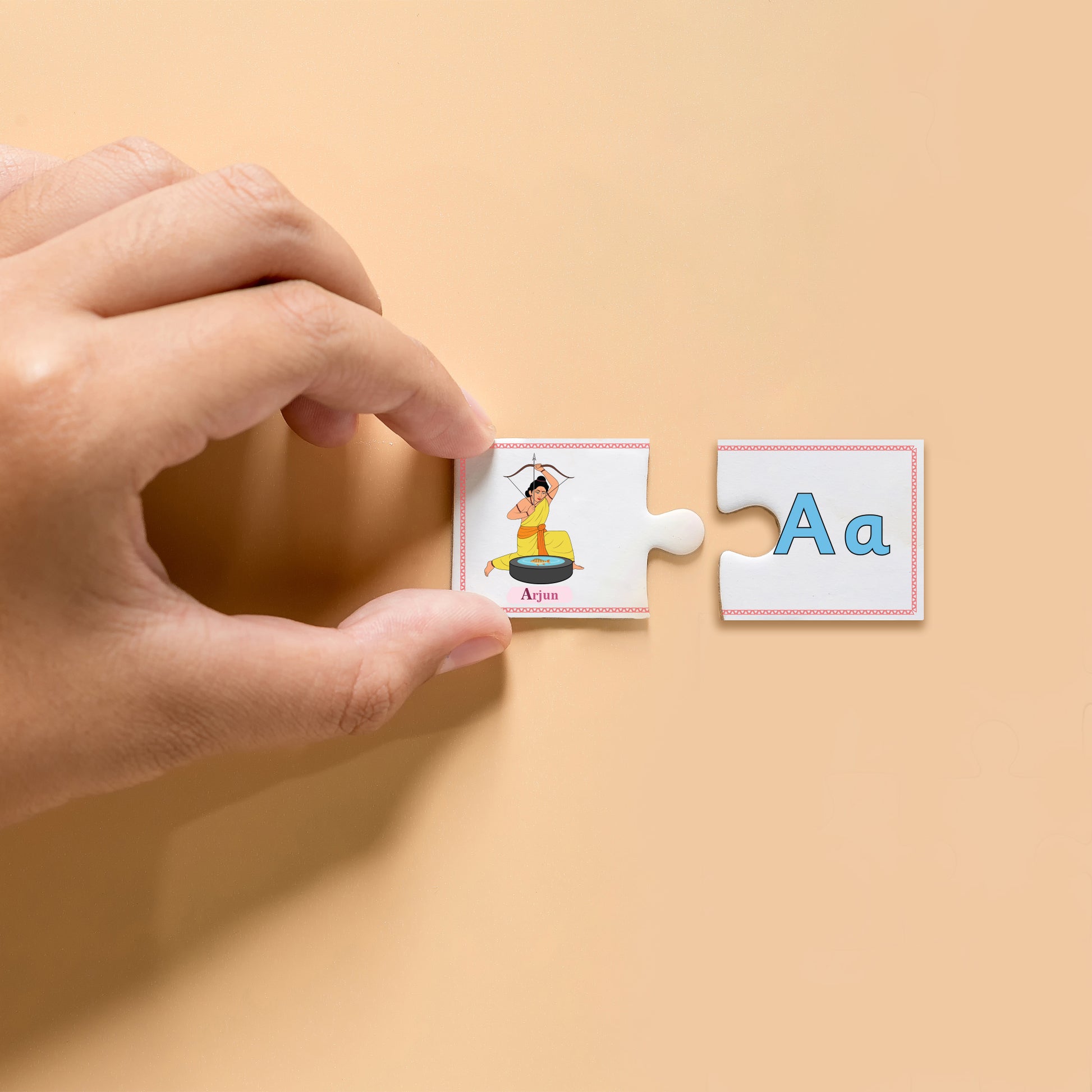 The Divine Puzzle is a bright and happy box of fun. Inside, you get 26 puzzles, and each one has two pieces. Kids will match letters like 'A' for Arjuna and 'B' for Balarama. It is a great way to learn about courage and kindness from these amazing heroes! The pieces are thick and strong, perfect for small hands to hold and play with again and again.