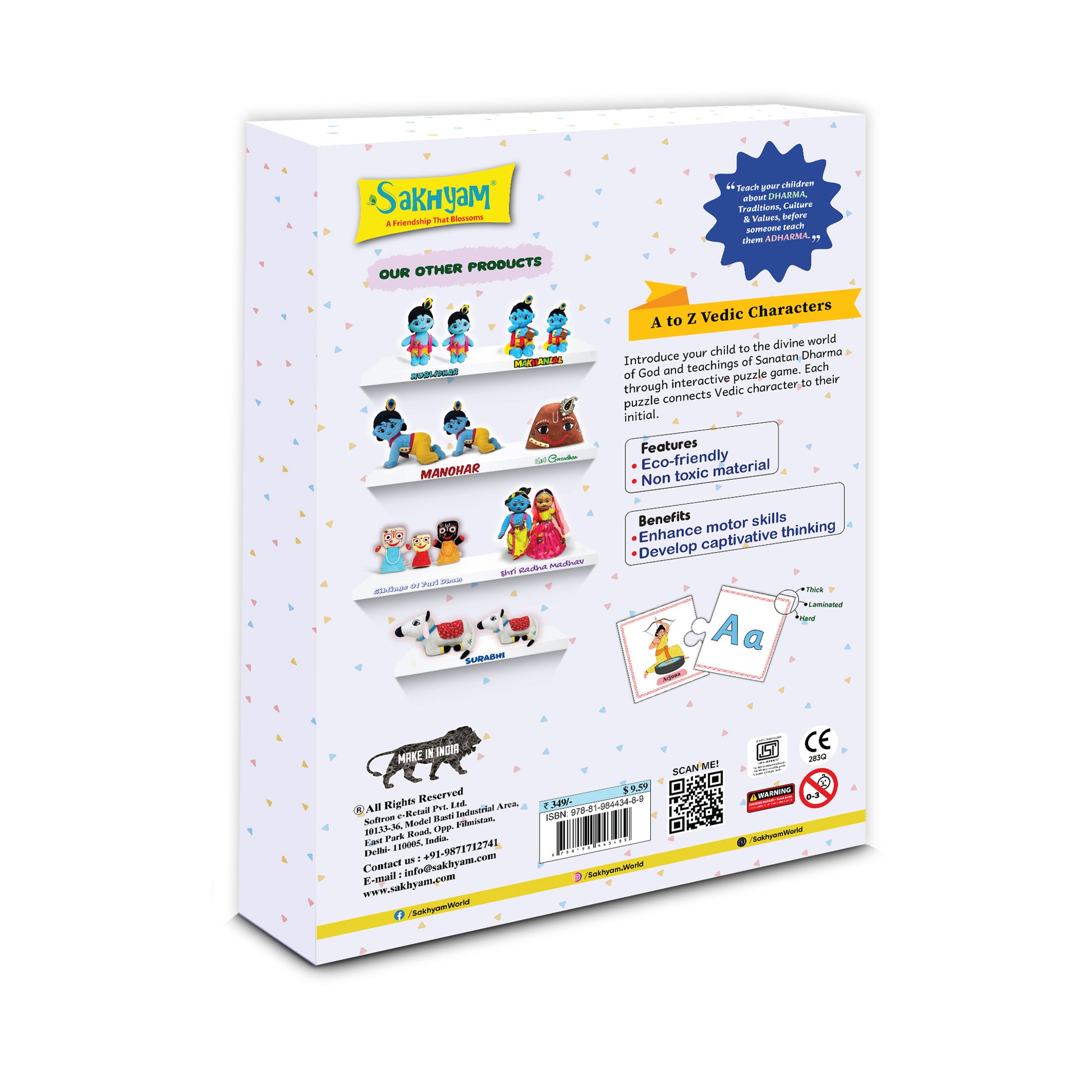 Give your child the gift of fun learning! This Divine Puzzle from Sakhyam helps kids learn their A-B-Cs while meeting cool characters from Hindu stories. It's a fun game where they match a letter to a picture of a Vedic hero or God.